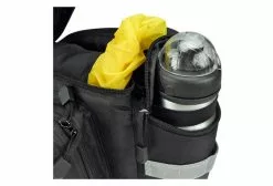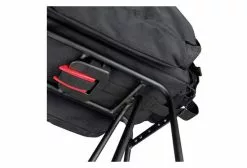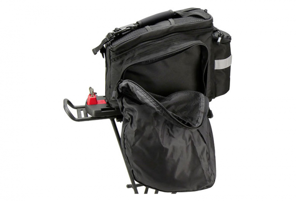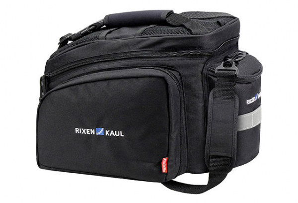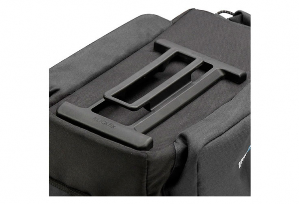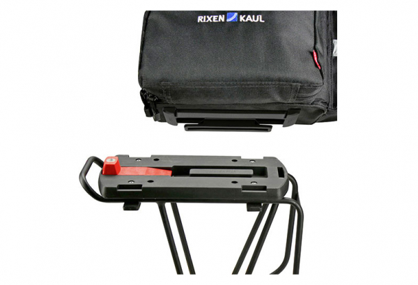 For GTA Adapter Multifunctional bag in the classic R&K design, with a good accessible, softfoam padded main compartment, big foldable sidebags and a half round compartment on the rear side where you can be store a bottle. A wet Jacket etc. can be securely fixed on top in net compartments or under under the adjustable handle. With rain cover, detachable shoulder belt, reflector and lightholder. (Hint: Unfolded sidepockets are not protected completely by the raincover. Sidebags can only be used on carriers with side support.) Baskets and topcases with GTA Coupling for upper central slot. Pushed forward to lock in. Press the red button to release. Combinable with GTA panniers.