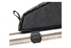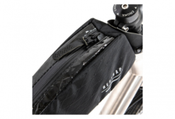 Die Tasche wird mit einem Dreipunkt-Hypalon-Anschluss fest in Position gehalten. Eine neue universelle Headset-Befestigung und eine interne Kunststoffstruktur halten die Tasche aufrecht, stabil und sicher und funktionieren mit allen Headsets, einschließlich Fahrrädern mit geringer Stapelhöhe. Eine verstellbare Rahmenbefestigung bedeutet, dass die Tasche mit den meisten Rahmentaschen und allen Restrap-Rahmentaschen funktioniert.